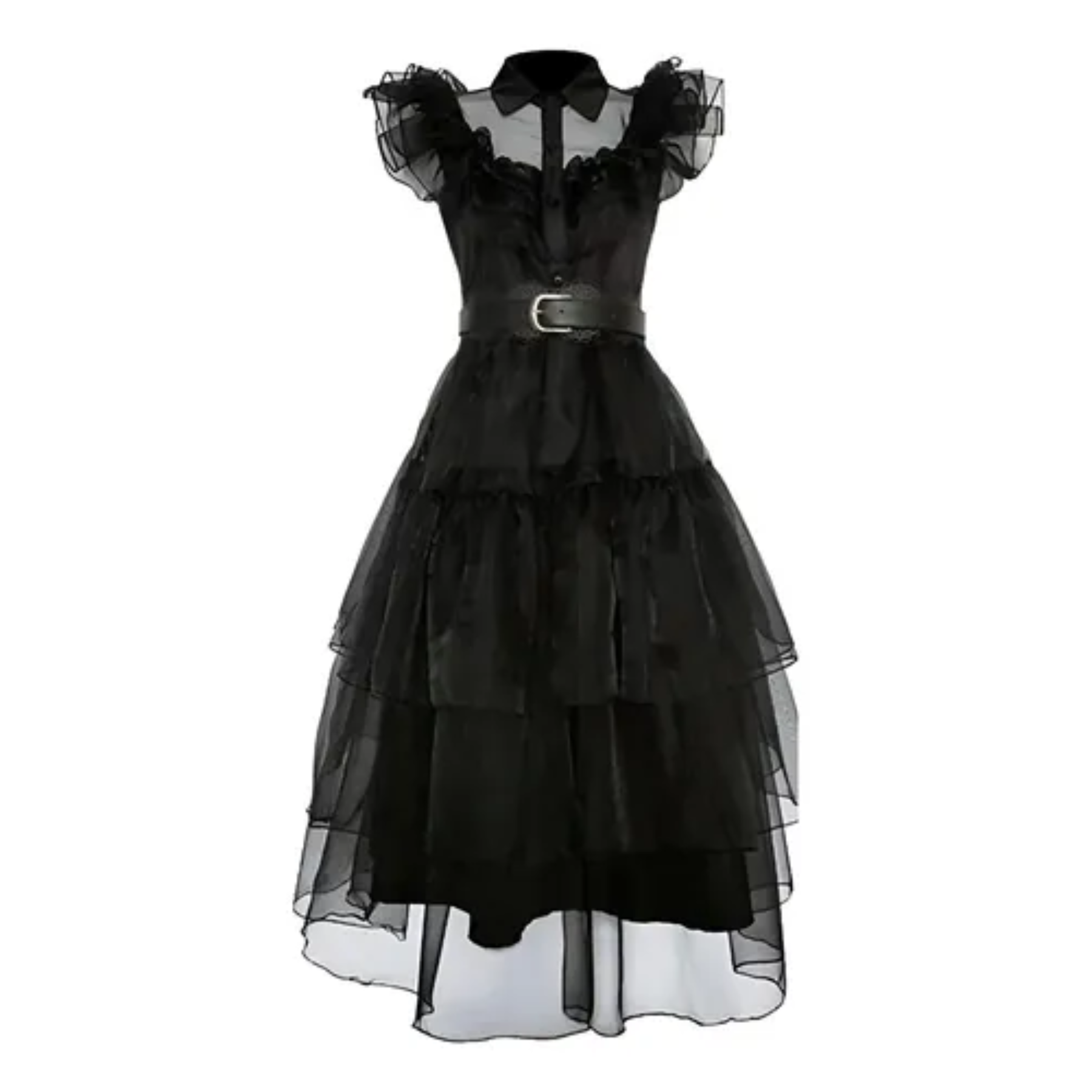 Estilo Gótico Elegante: Vestido negro con detalles que evocan el estilo sombrío y peculiar de la serie.